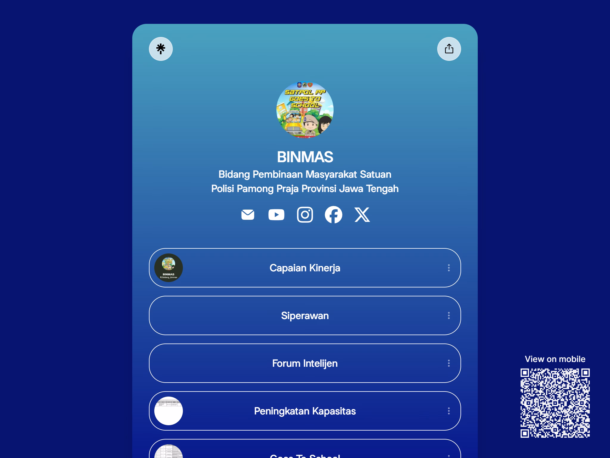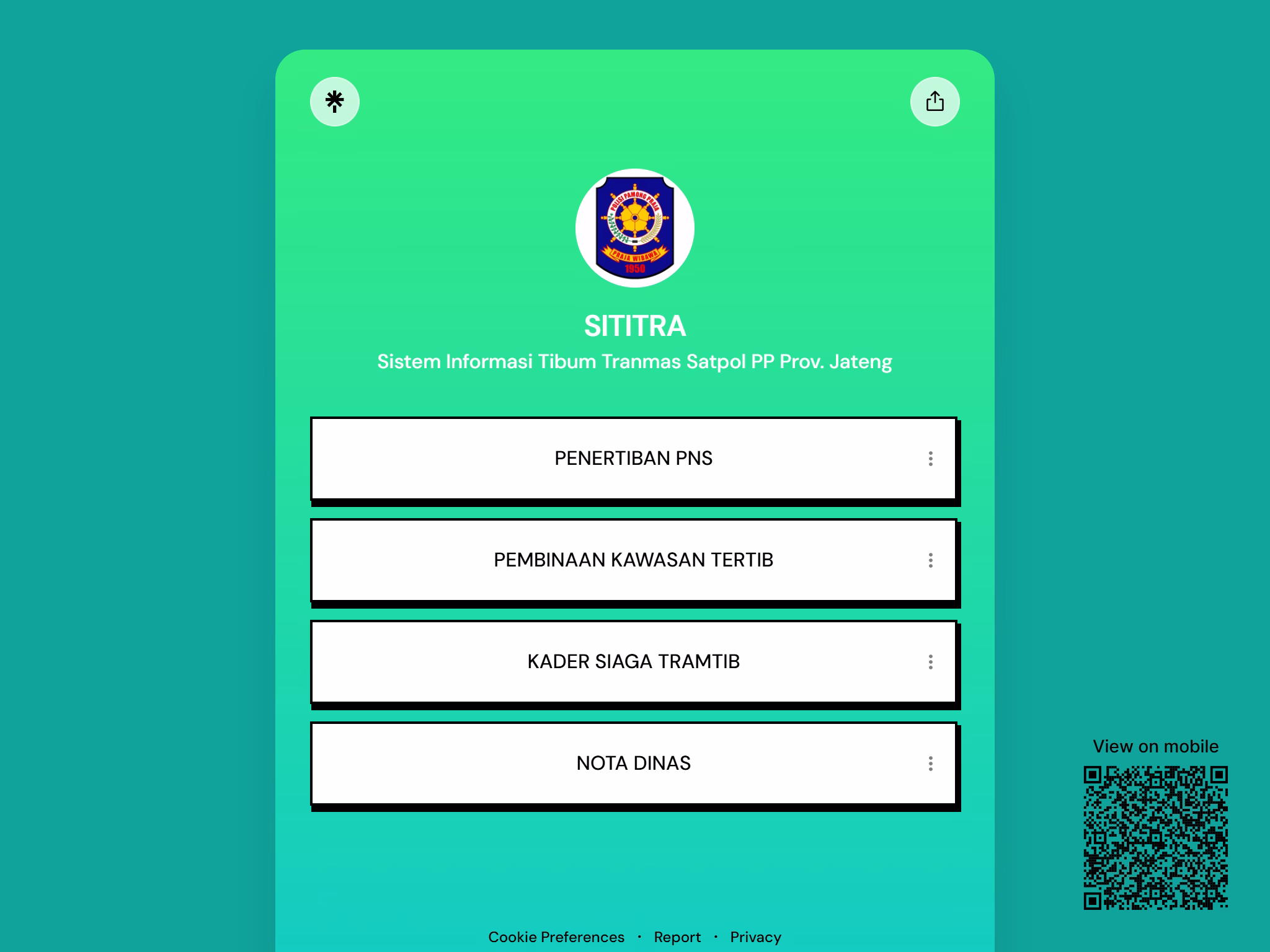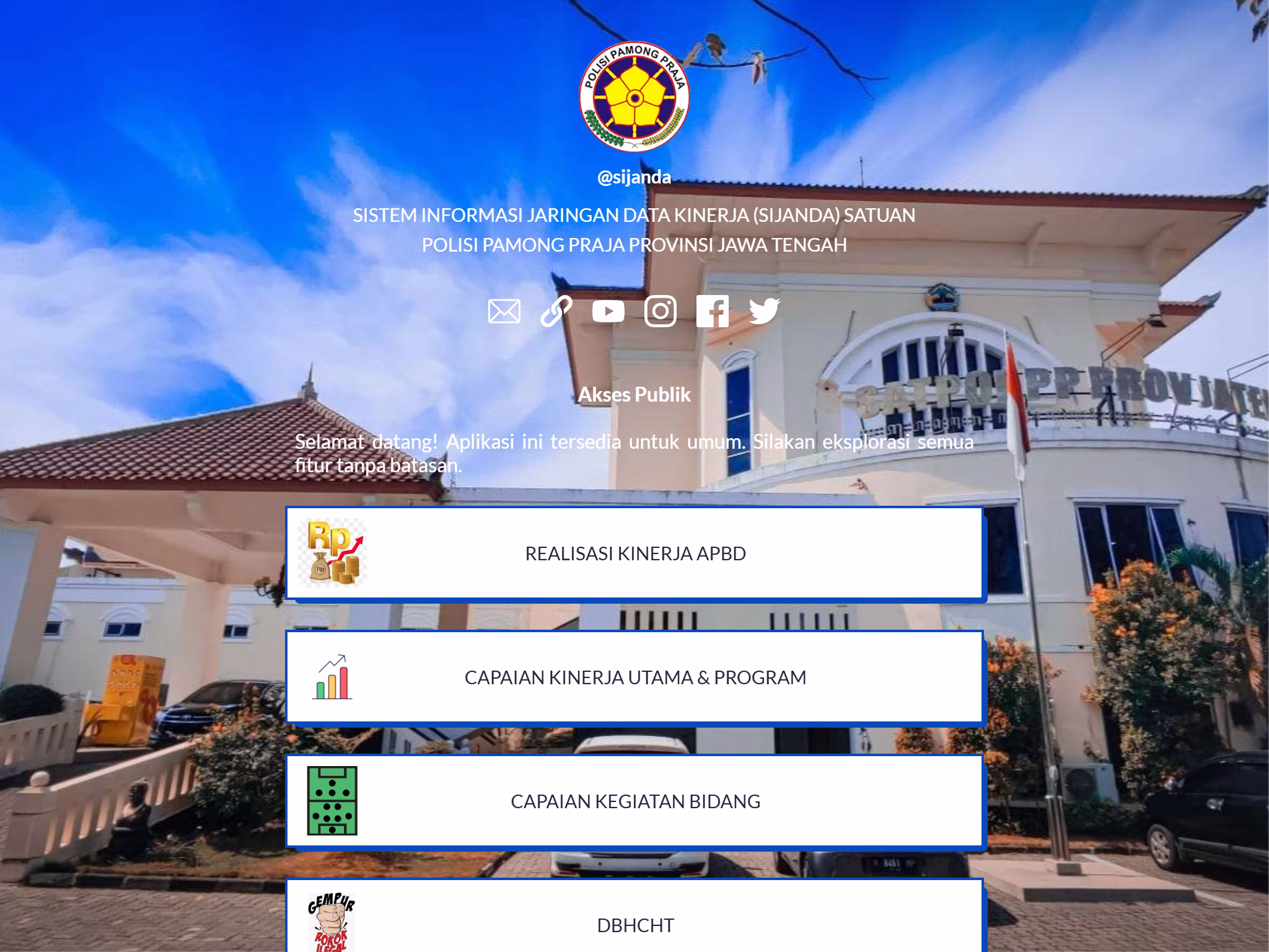 Halaman Aplikasi Satuan Polisi Pamong Praja Provinsi Jawa Tengah menyediakan akses menuju berbagai sistem informasi dan aplikasi layanan yang dikembangkan untuk mendukung tugas, fungsi, serta pelayanan publik Satpol PP.